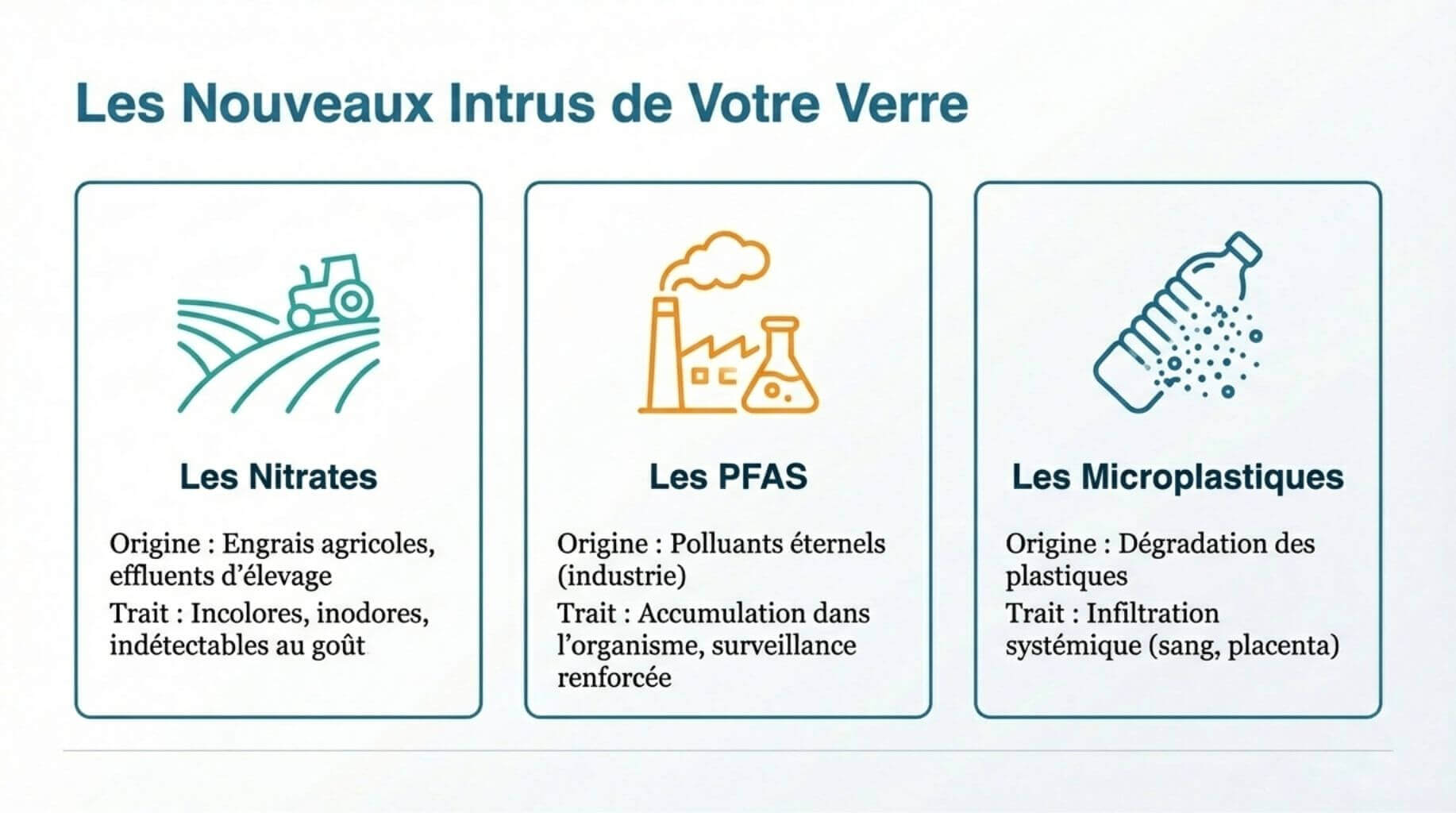 Entre nitrates proches des seuils, PFAS omniprésents et microplastiques invisibles, une évidence s’impose :